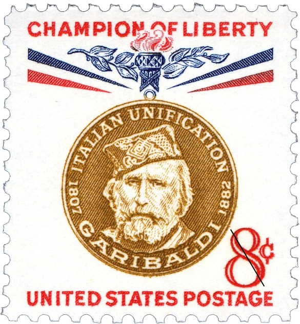 The Post Office Department released two stamps honoring Giuseppe Garibaldi (1807–1882), the father of "Italian Unification," on November 2, 1960. Garibaldi, an Italian patriot and revolutionary, led an invasion of Sicily in 1860 that led to the unification of Italy under King Victor Emmanuel II.