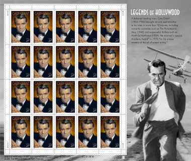 With the issuance of this eighth stamp in the Legends of Hollywood series, the U.S. Postal Service honors American film legend Cary Grant. Artist Michael J. Deas based his painting of Grant on a black-and-white publicity photograph made in 1951 or 1952 by Warner Bros. photographer Bert Six.