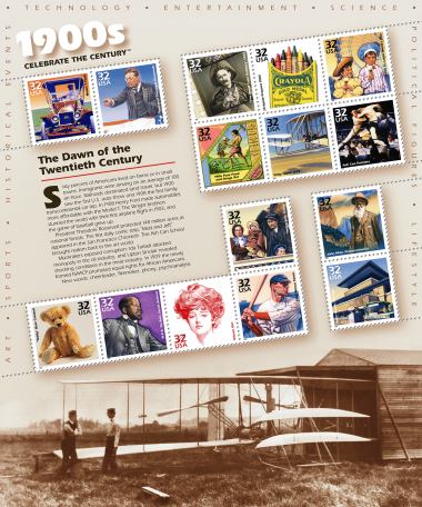 The USPS launched the Celebrate the Century series in 1998 to mark the end of the 20th century and herald the arrival of the 21st. The series includes 10 sheets of 15 stamps (150 in total), with each honoring important moments from a different decade (1900s, '10s, '20s, '30s, '40s, '50s, '60s, '70s, '80s, and '90s). At the time of completion, it was the longest and most ambitious commemorative stamp series in US history.