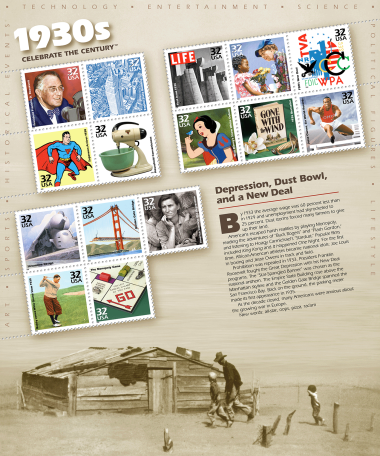 The USPS launched the Celebrate the Century series in 1998 to mark the end of the 20th century and herald the arrival of the 21st. The series includes 10 sheets of 15 stamps (150 in total), with each honoring important moments from a different decade (1900s, '10s, '20s, '30s, '40s, '50s, '60s, '70s, '80s, and '90s). At the time of completion, it was the longest and most ambitious commemorative stamp series in US history.