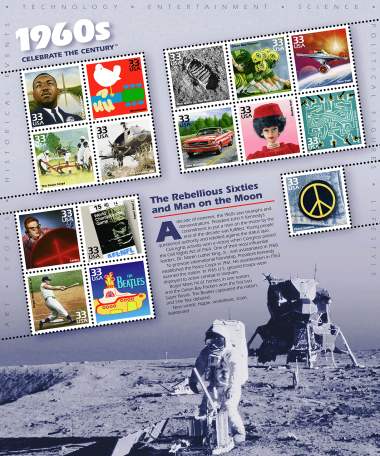 The USPS launched the Celebrate the Century series in 1998 to mark the end of the 20th century and herald the arrival of the 21st. The series includes 10 sheets of 15 stamps (150 in total), with each honoring important moments from a different decade (1900s, '10s, '20s, '30s, '40s, '50s, '60s, '70s, '80s, and '90s). At the time of completion, it was the longest and most ambitious commemorative stamp series in US history.