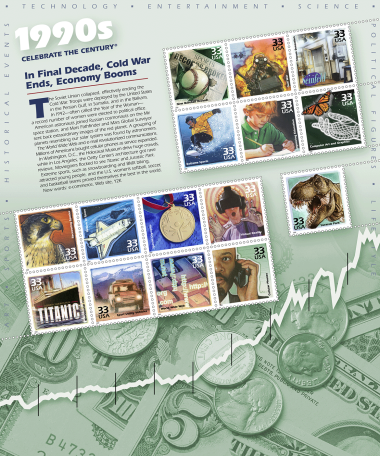 The USPS launched the Celebrate the Century series in 1998 to mark the end of the 20th century and herald the arrival of the 21st. The series includes 10 sheets of 15 stamps (150 in total), with each honoring important moments from a different decade (1900s, '10s, '20s, '30s, '40s, '50s, '60s, '70s, '80s, and '90s). At the time of completion, it was the longest and most ambitious commemorative stamp series in US history.
