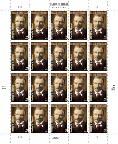 With the 31st stamp in its Black Heritage series, the U.S. Postal Service honors Charles W. Chesnutt, a pioneering writer whose work addressed a broad range of African-American experience during the post-Civil War period known as the Reconstruction era. Chesnutt made an important breakthrough when his short story “The Goophered Grapevine” appeared in the August 1887 issue of Atlantic Monthly. He was proud to be published in such a prestigious publication, and was one of few African-American writers to have done so at that time.