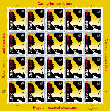 The U.S. Postal Service continues its tradition of drawing attention to important public issues with this stamp promoting children’s health. Art director Carl T. Herrman and stamp artist Craig Frazier show a silhouette of a health care provider placing a stethoscope on a child’s chest.