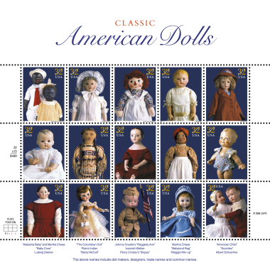 The Postal Service commemorated Classic American Dolls with the issuance of a pane of 15 32-cent stamps on July 28, 1997, in Anaheim, California.