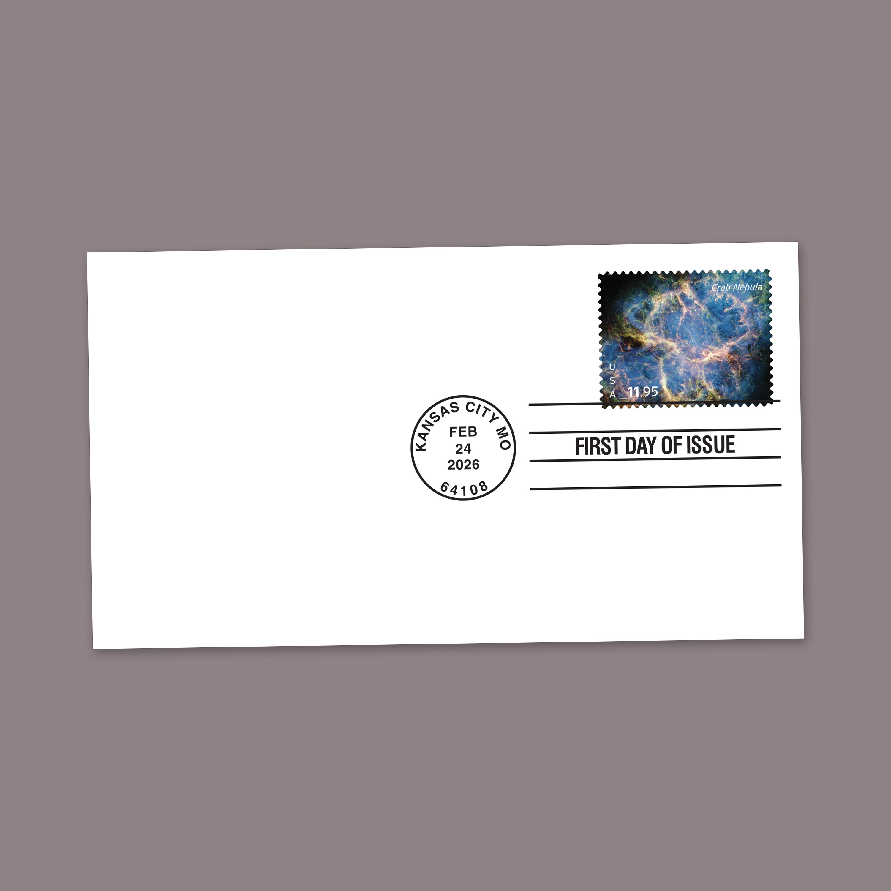 Discover a cosmic wonder with the Crab Nebula First Day Cover. The collectible envelope features a Priority Mail® Crab Nebula stamp canceled with the official First Day of Issue postmark.