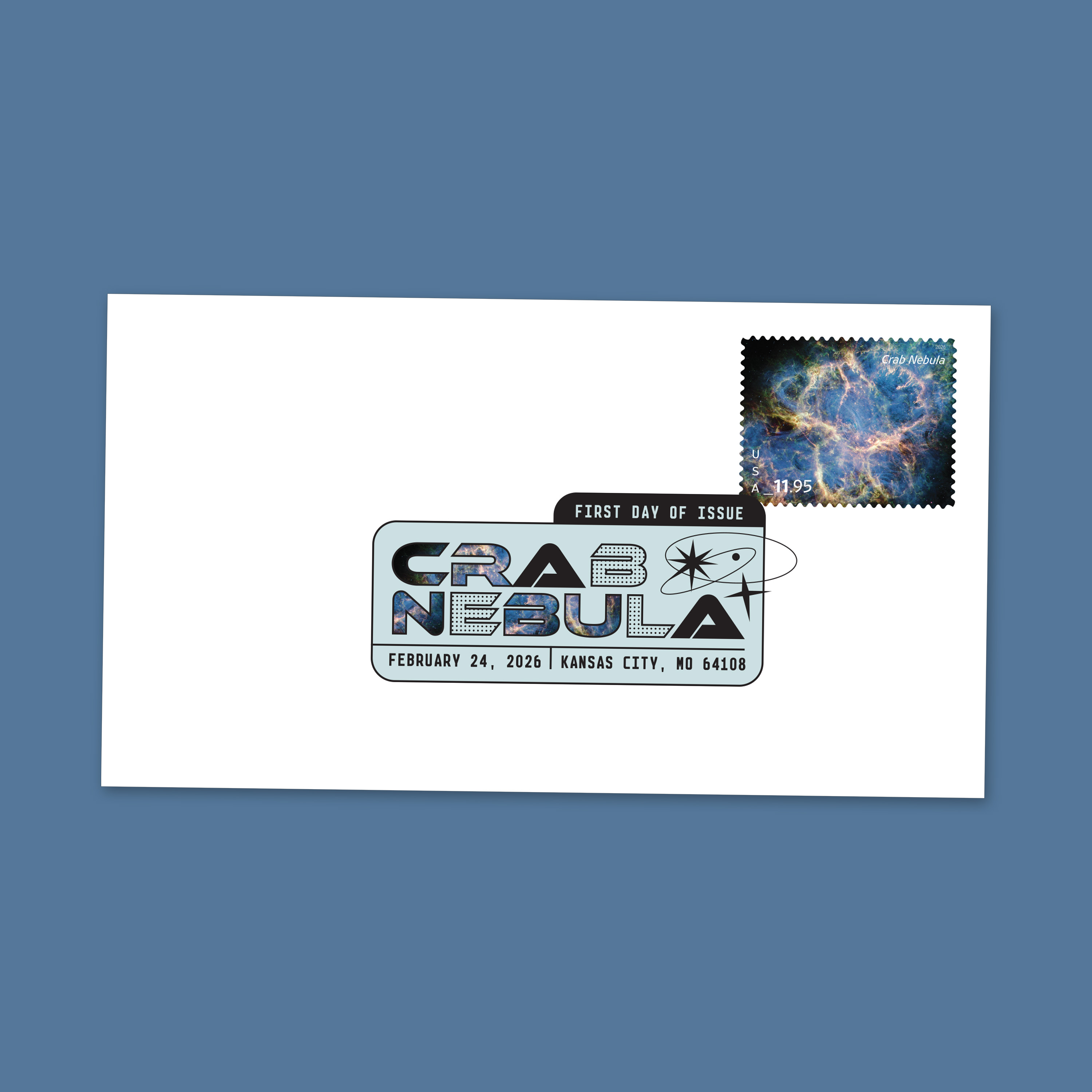 Discover a cosmic wonder view with this Crab Nebula Digital Color Postmark. The collectible envelope features a full-color postmark canceling the Priority Mail® Crab Nebula stamp — the perfect keepsake for space enthusiasts and collectors alike.