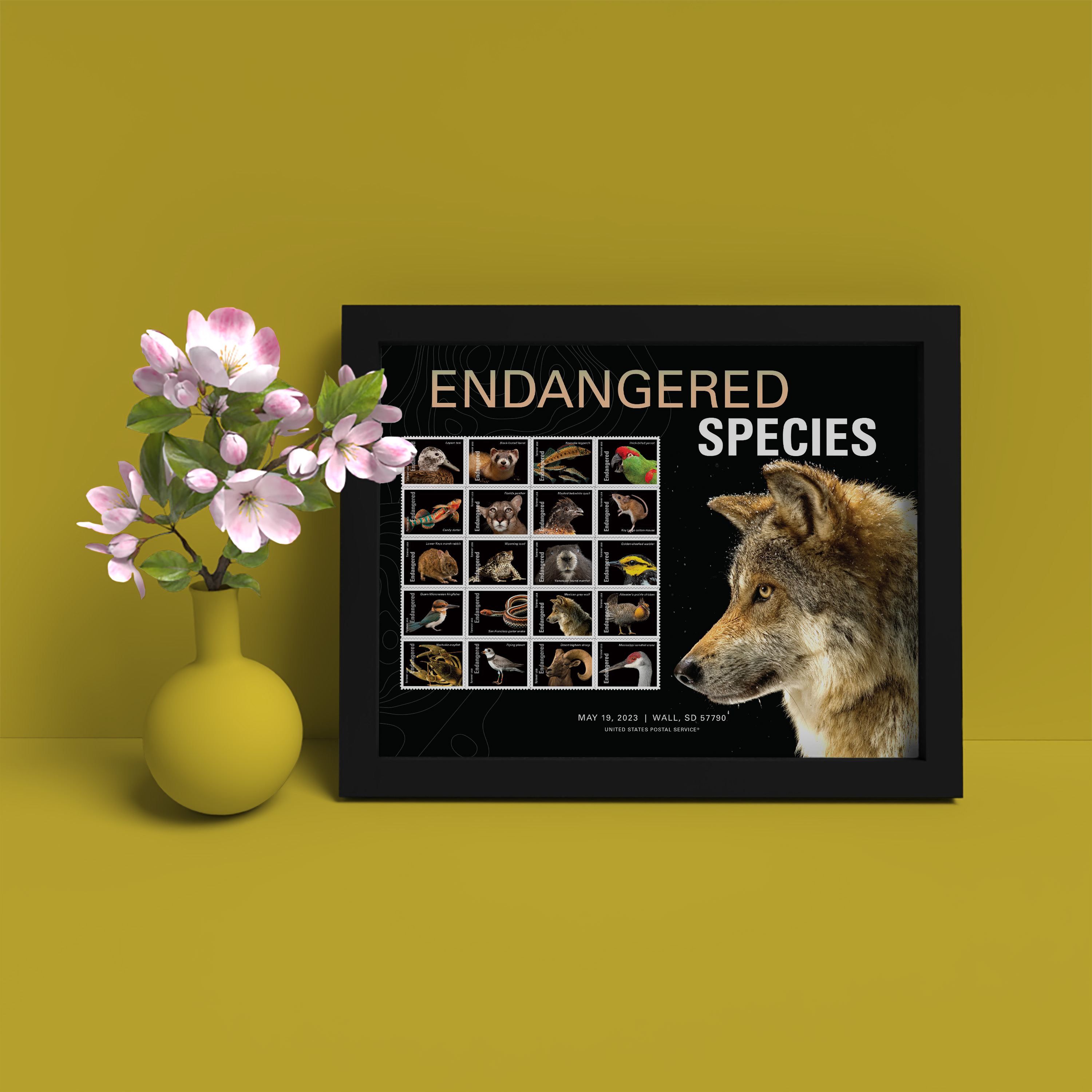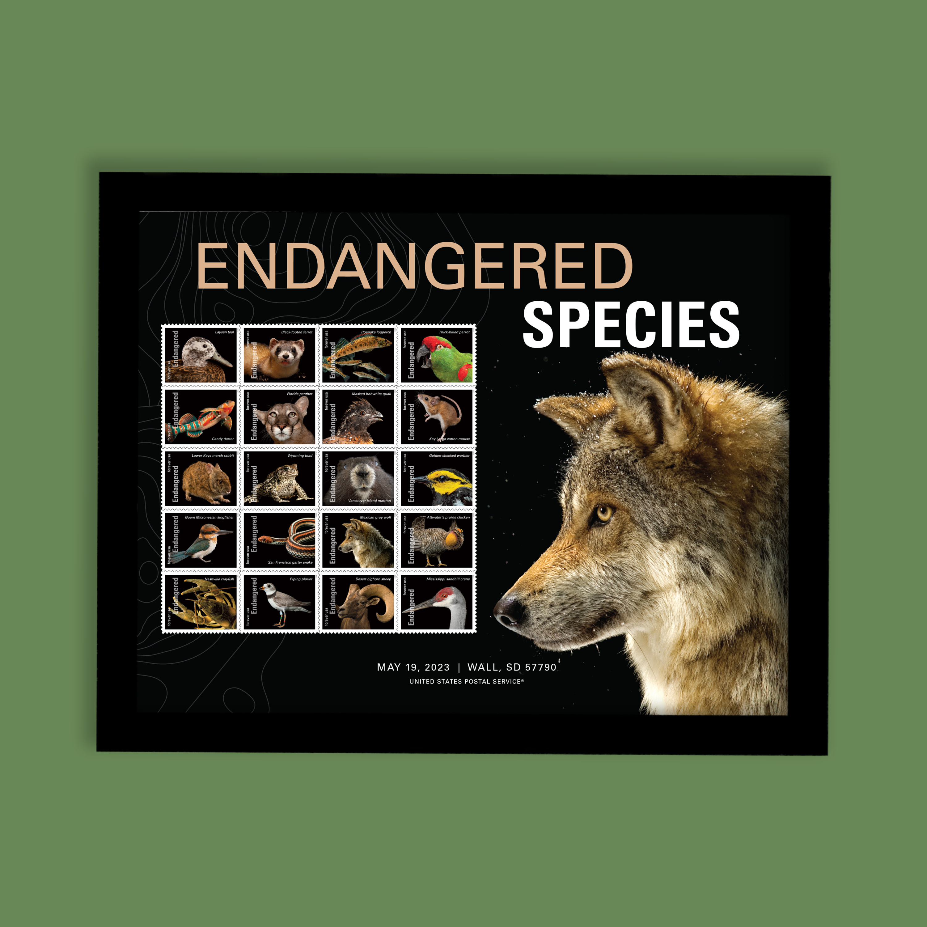 Commemorate the 50th anniversary of the Endangered Species Act with this striking 14.5" x 11.5" framed image of the Mexican gray wolf along with a block of 20 mounted Endangered Species Forever® stamps and the First Day of Issue details.