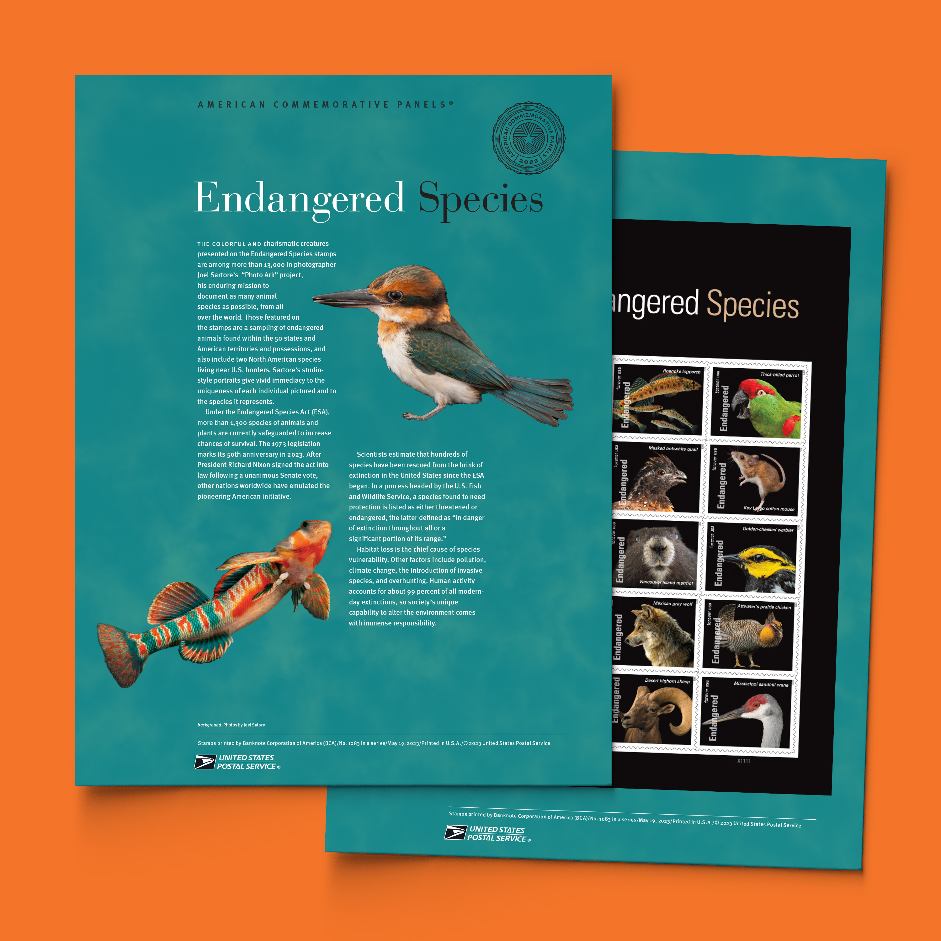 Commemorate the 50th anniversary of the Endangered Species Act with this two-page American Commemorative Panel®. One of the 8 ½ x 11 ¼-inch panels, printed on sturdy card stock, features a narrative about the stamps and the Endangered Species Act, and includes an intaglio-printed component designed explicitly for the American Commemorative Panels® program. The second panel is accompanied by a pane of 20 Endangered Species Forever® stamps in a protective acetate mount.