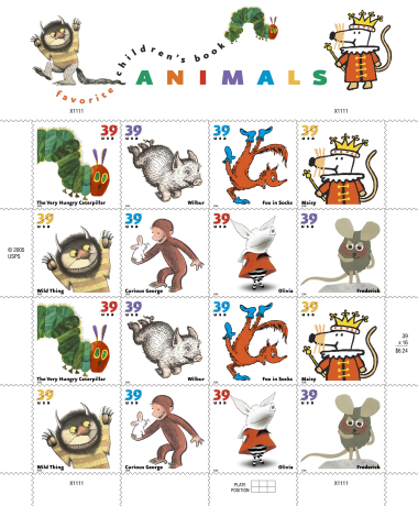 In 2006 the U.S. Postal Service honored eight cherished animal characters from children's literature with the Favorite Children's Book Animals stamp pane. Children and adults alike will delight in these lively and colorful stamps, two of which — The Very Hungry Caterpillar and Maisy — were also issued by Royal Mail in the United Kingdom.