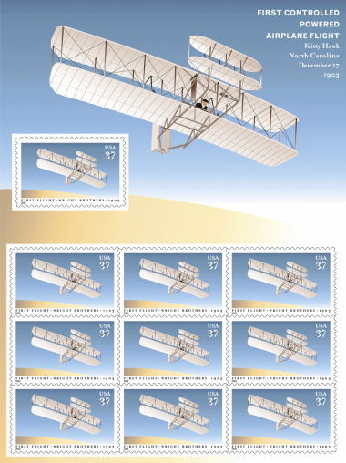 In 2003, the U.S. Postal Service issued this souvenir sheet to commemorate the 100th anniversary of the first controlled, powered, sustained flight in a heavier-than-air flying machine.