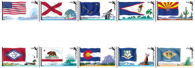 In 2008, the U.S. Postal Service introduced a new multi-stamp series featuring the Stars and Stripes, the 50 state flags, five territorial flags, and the District of Columbia flag. Ten stamps were issued in the spring (Stars and Stripes, plus Alabama through Delaware), followed by 10 more in the fall (District of Columbia through Kansas). The same process was repeated in 2009 and 2010, for a total of 60 stamp designs. Four of the six groups of 10 included a Stars and Stripes stamp.