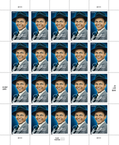 With this stamp, the U.S. Postal Service honors Frank Sinatra, an Oscar-winning actor and a supreme interpreter of American popular song. Art director Richard Sheaff and stamp artist Kazuhiko Sano have chosen to present this iconic figure in a portrait based on a photograph by an unknown photographer.
