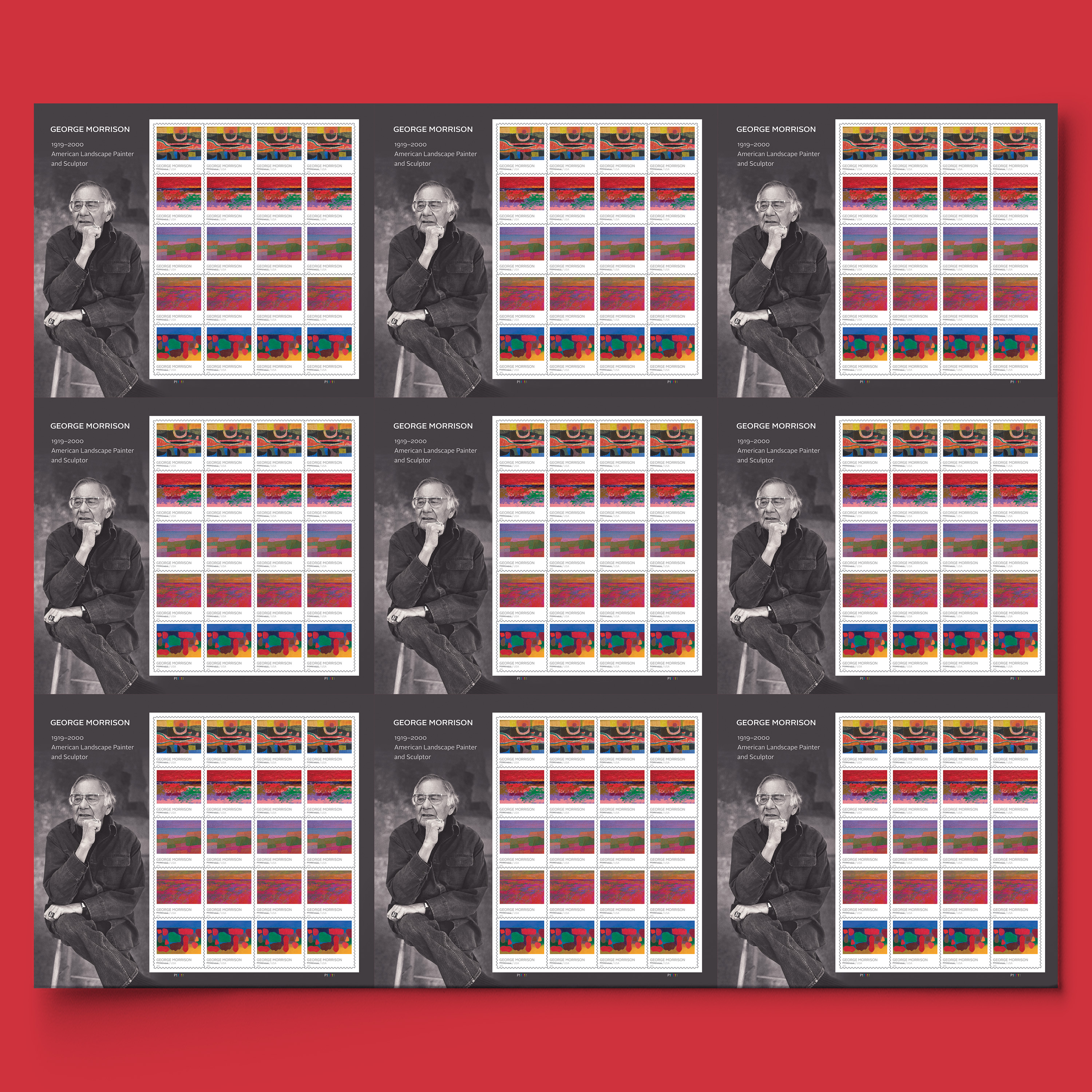 Celebrate a groundbreaking Native American artist with this 25" x 21.61" press sheet, containing nine sheets of George Morrison Forever® stamps positioned three across by three down.