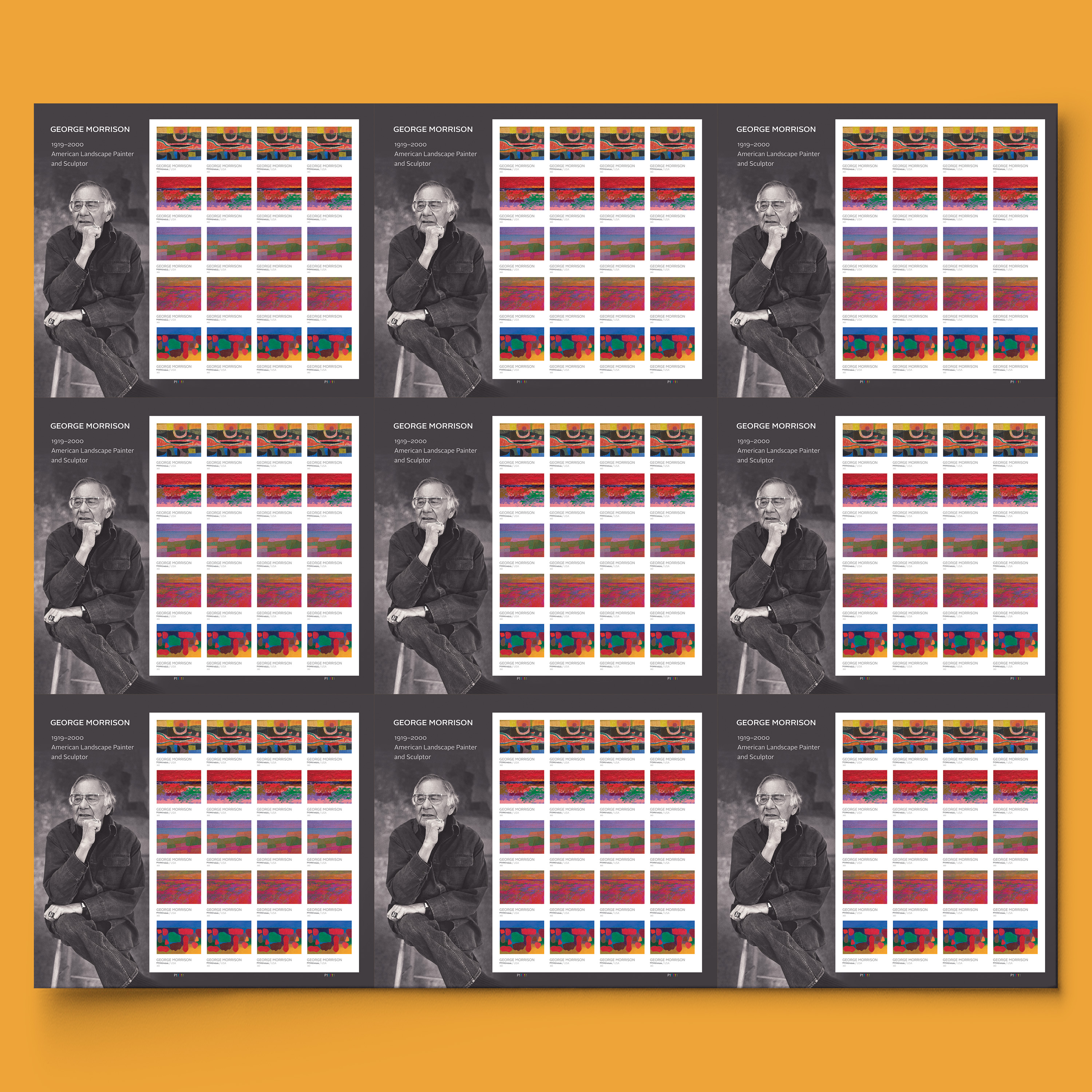 Celebrate a groundbreaking Native American artist with this 25" x 21.61" press sheet, containing nine sheets of George Morrison Forever® stamps positioned three across by three down.