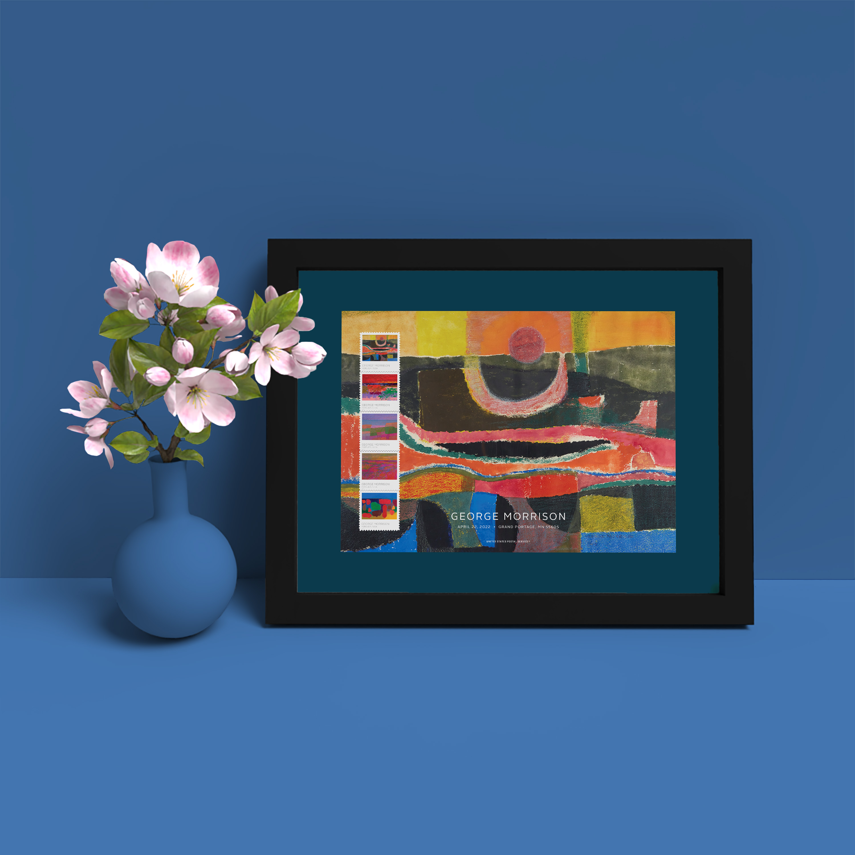 Celebrate a groundbreaking Native American artist with this 14.5" x 11.5" framed piece, which features the art from the George Morrison (Sun and River) stamp, plus a strip of five mounted Forever® stamps and the First Day of Issue details.