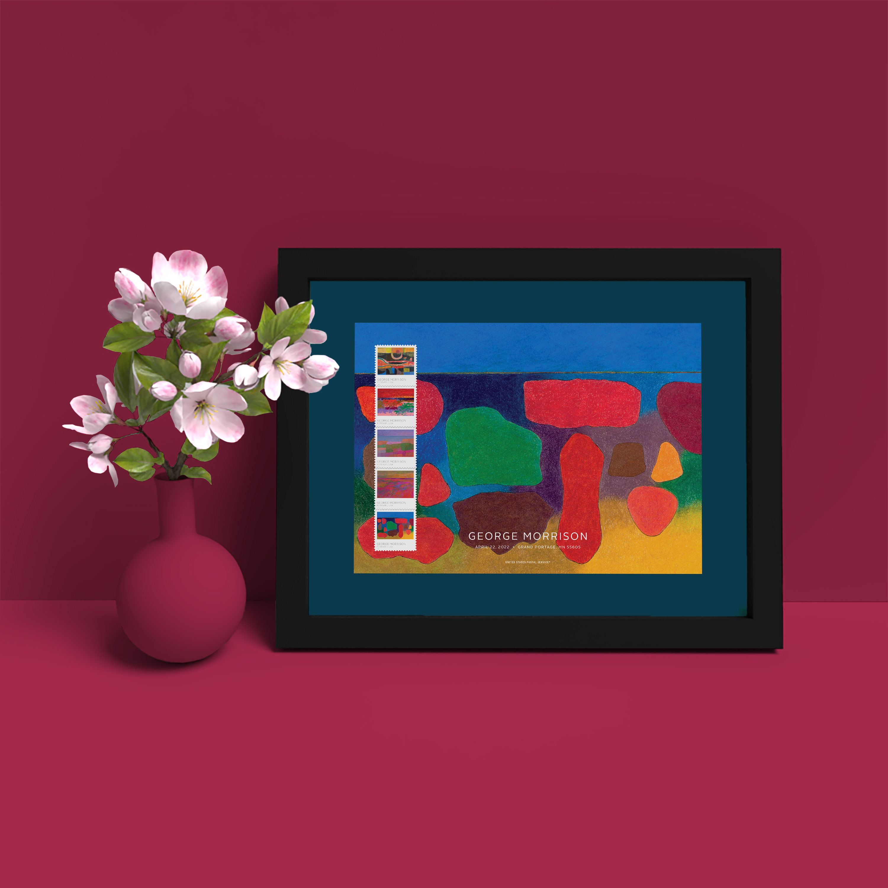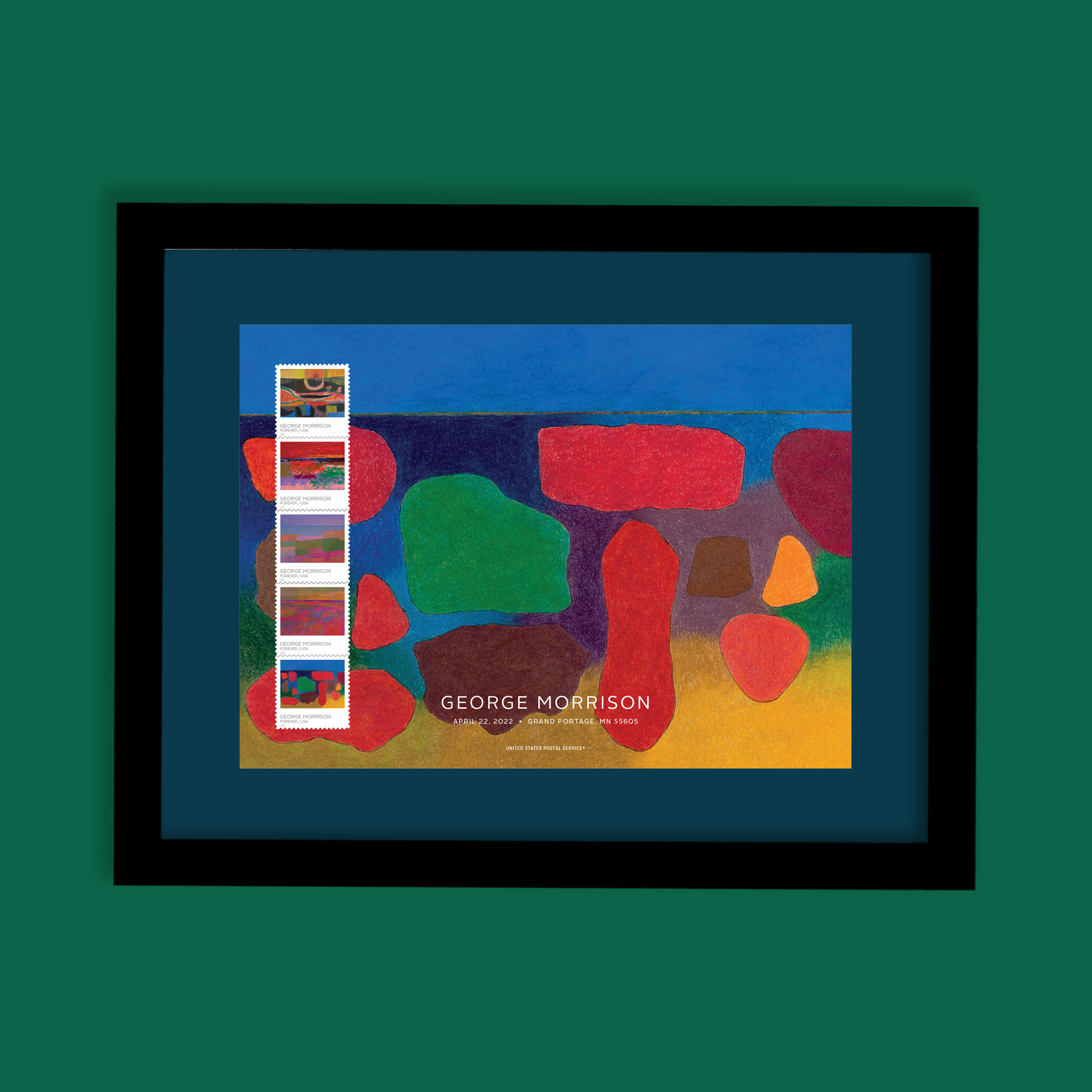 Celebrate a groundbreaking Native American artist with this 14.5" x 11.5" framed piece, which features the art from the George Morrison (Untitled) stamp, plus a strip of five mounted Forever® stamps and the First Day of Issue details.