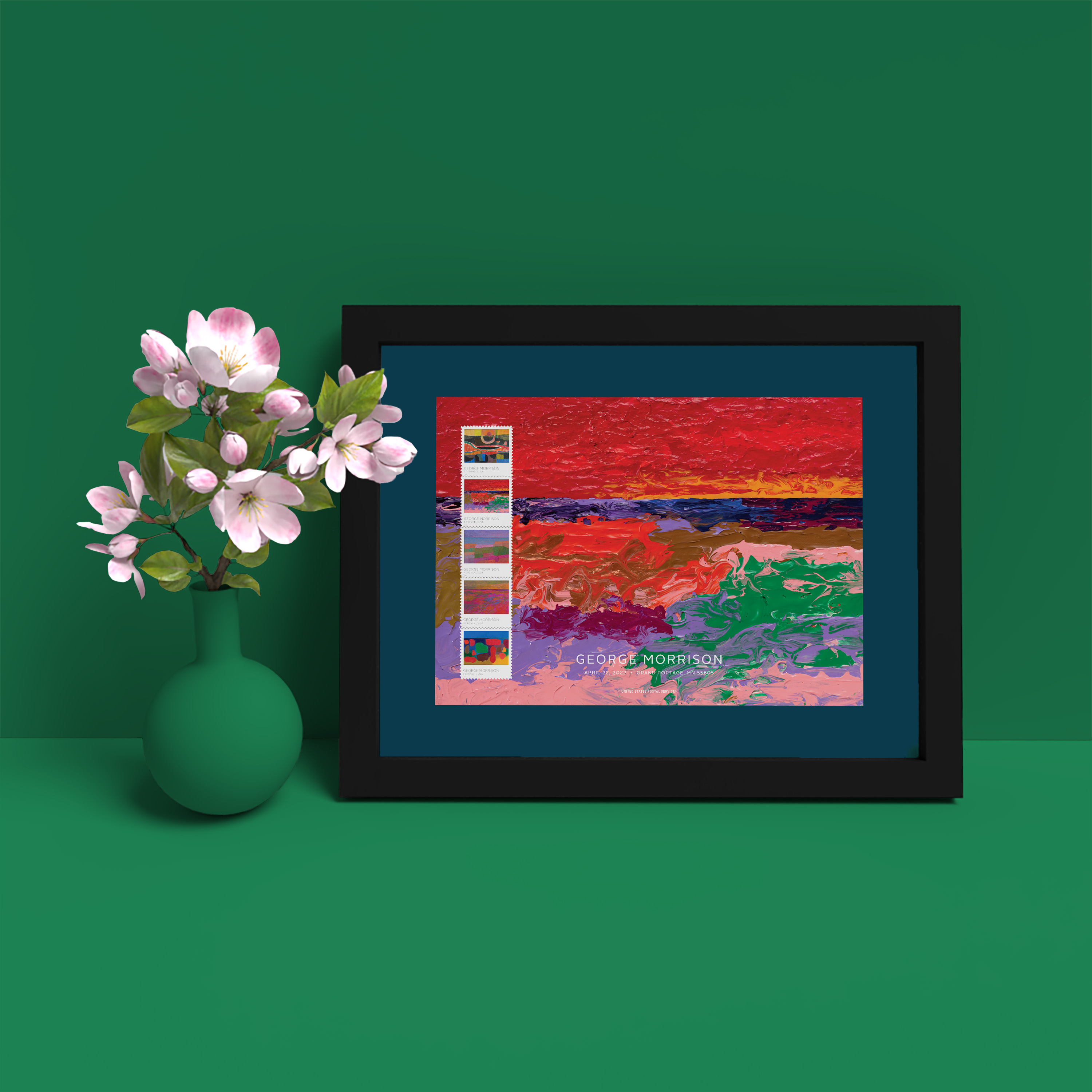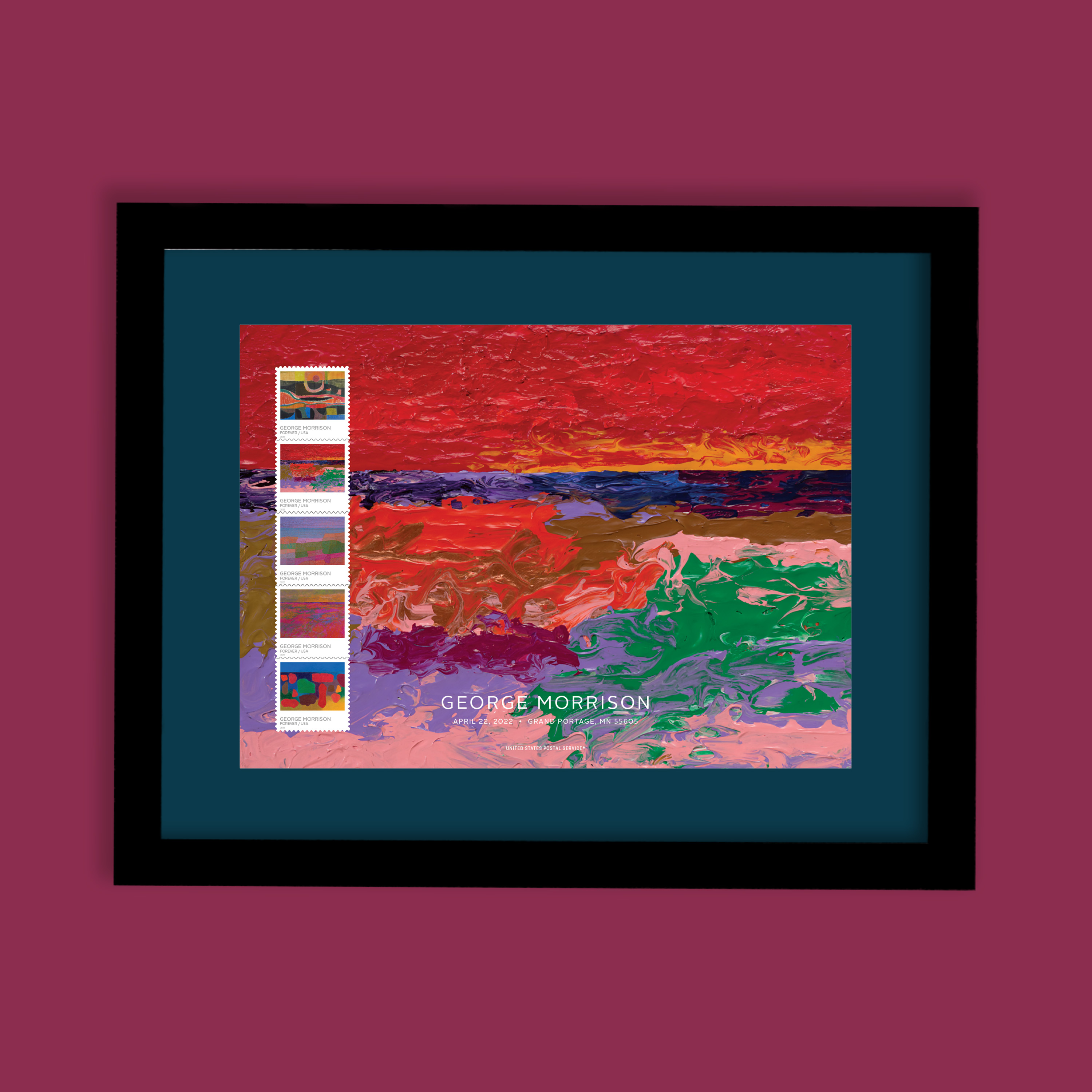 Celebrate a groundbreaking Native American artist with this 14.5" x 11.5" framed piece, which features the art from the George Morrison (Phenomena Against the Crimson) stamp, plus a strip of five mounted Forever® stamps and the First Day of Issue details.
