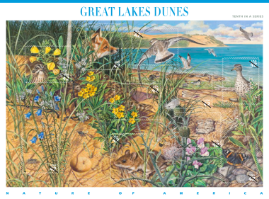 The 2008 Nature of America issuance, "Great Lakes Dunes," is the tenth stamp pane in an educational series that features the beauty and complexity of major plant and animal communities in the United States.