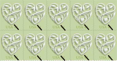 The artwork on the 2008 Hearts stamps was created by illustrator Nancy Stahl, who based her designs on memories of a wide range of intertwined objects, including silver charms and old-fashioned garden gates. The one-ounce denomination features a light green background, while the two-ounce denomination features a pale peach background.