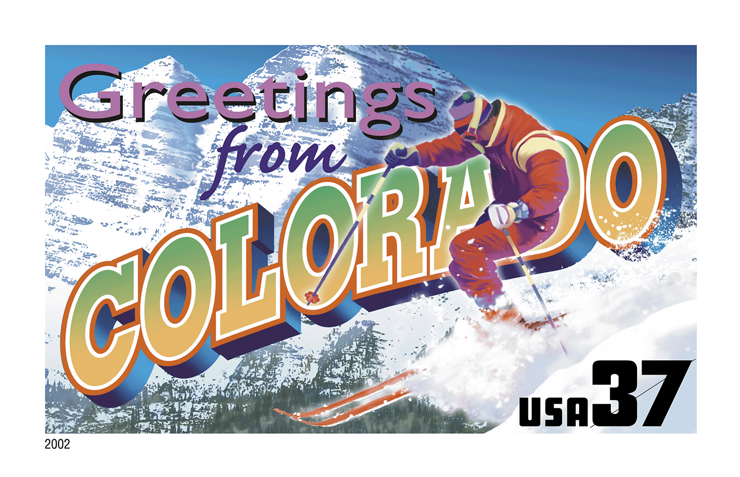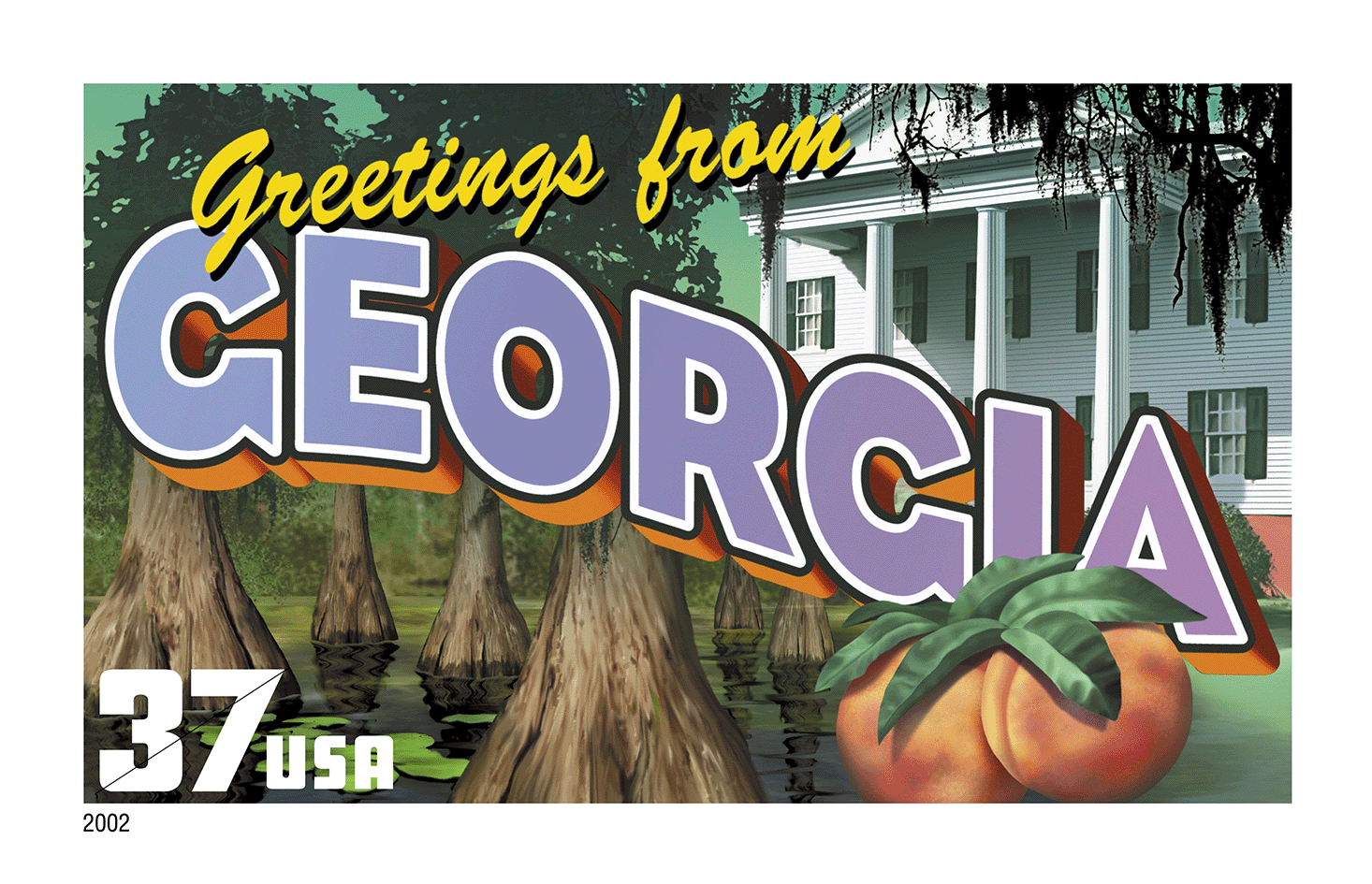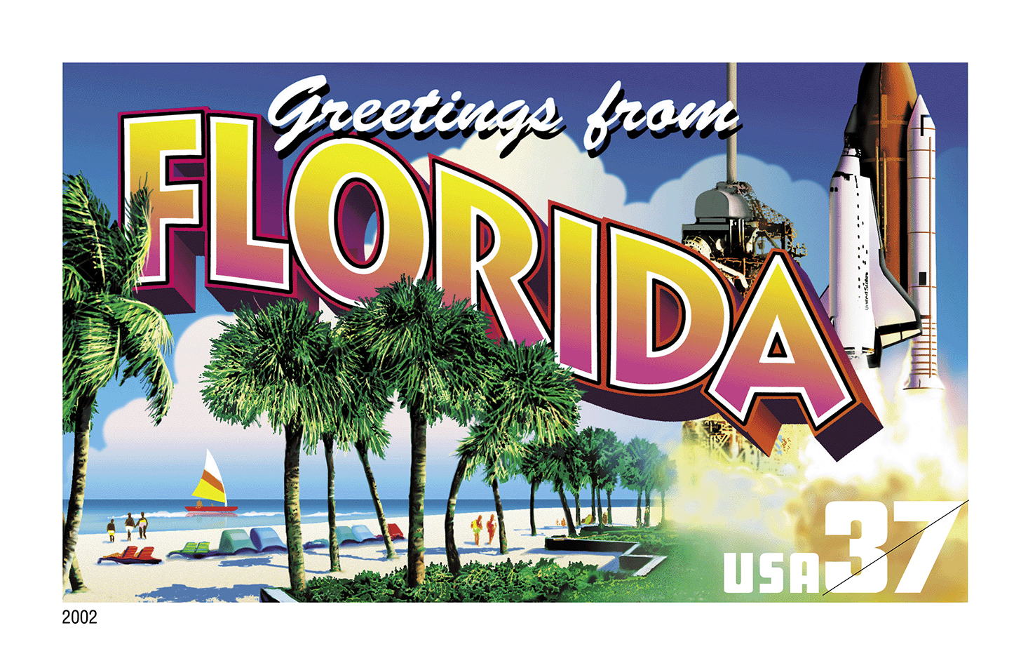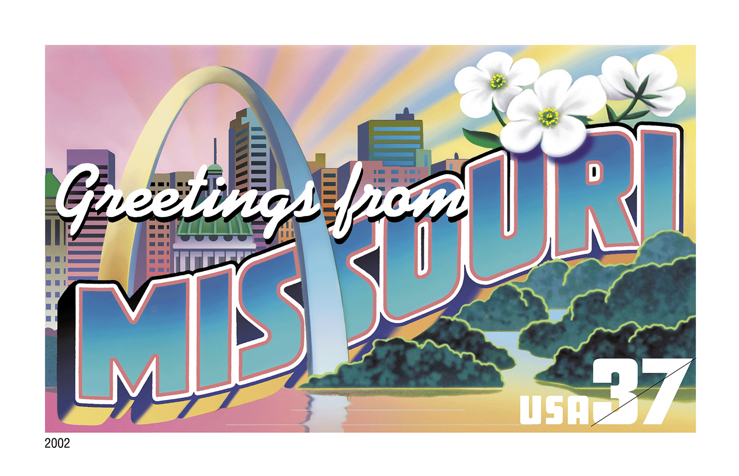 Inspired by the retro "large letter" postcards that were used to advertise cities, states, or tourist attractions, artist Lonnie Busch combined flora and fauna with local points of interest into colorful collages that celebrate the unique character of each state. Text on the back of each stamp listed each state's bird, flower, tree, and capital, as well as the date it entered the Union.*
