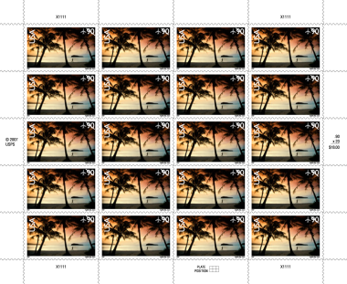 The stamp features a photograph by Michael S. Yamashita of a sunset at Hagåtña Bay in Hagatna, the capital of Guam. The capital was known as Agana until 2002, when it was officially changed back to its pre–World War II name.