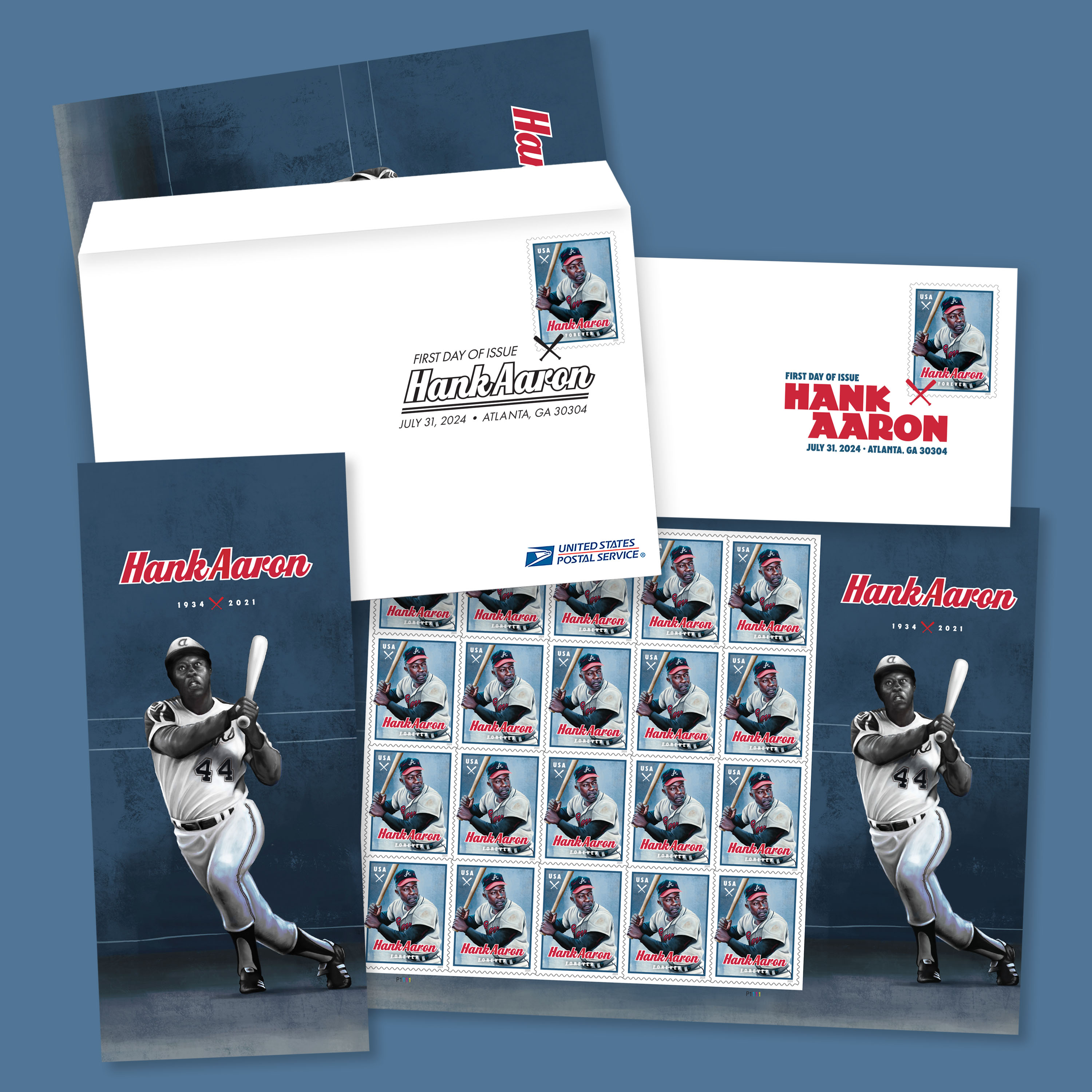 This collectible comes with everything you need to celebrate the issuance. It contains the First Day of Issue Ceremony Invitation, the First Day of Issue Ceremony Program, a Digital Color Postmark First Day Cover, and a pane of 20 Hank Aaron Forever® stamps.