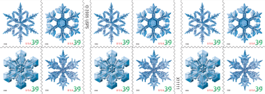 In 2006 the U.S. Postal Service celebrated the winter holiday season with four stamps featuring photographs of snowflakes. Falling from thousands of feet, these intricate ice crystals commonly begin as a piece of dust tumbling through the clouds. Gathering water molecules, they blossom into crystal forms in endlessly different patterns because of the constantly changing conditions of the atmosphere.