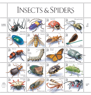 Depicting 16 insects and four spiders, the stamps represent a range of colors, lifestyles, and behaviors in the insect and spider communities of the United States. On the back of each stamp is text describing the unique features of the insect or spider depicted on the front.