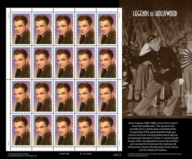 James Francis Cagney, Jr., was born in New York City on July 17, 1899. He began in show business in 1919, and throughout the 1920s Cagney moved between stage and vaudeville. In 1930, he went to Hollywood and landed a contract with Warner Bros. On the 100th anniversary of the year of his birth, the US Postal Service honored James Cagney with the issuance of the fifth stamp in the Legends of Hollywood series.