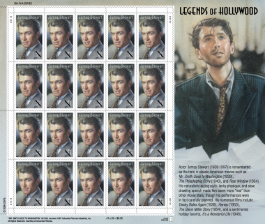 With the 13th stamp in its Legends of Hollywood series, the U.S. Postal Service honors James Stewart (1908–1997), the American film star who is remembered as the hero in classic American movies such as Mr. Smith Goes to Washington (1939), The Philadelphia Story (1940), and Rear Window (1954). His naturalistic acting style, lanky physique, and slow, drawling speech made him seem more "real" than other movie stars, though his performances were in fact carefully planned. His numerous films include Destry Rides Again (1939), Harvey (1950), The Glenn Miller Story (1954), and a sentimental holiday favorite, It's a Wonderful Life (1946).