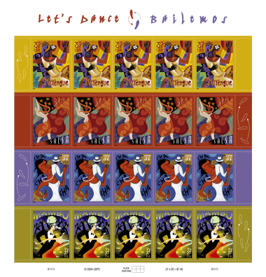 Honoring the contributions of Latino art to American culture, the U.S. Postal Service issued four stamps in 2005 featuring dances that trace their roots to the Caribbean islands. Showcasing one of four popular dances on each stamp, Latino artists have created designs that express their personal interpretations of merengue, salsa, cha-cha-cha, and mambo, using vivid colors and sinuous shapes to capture the energy generated by dancers moving to the beat.