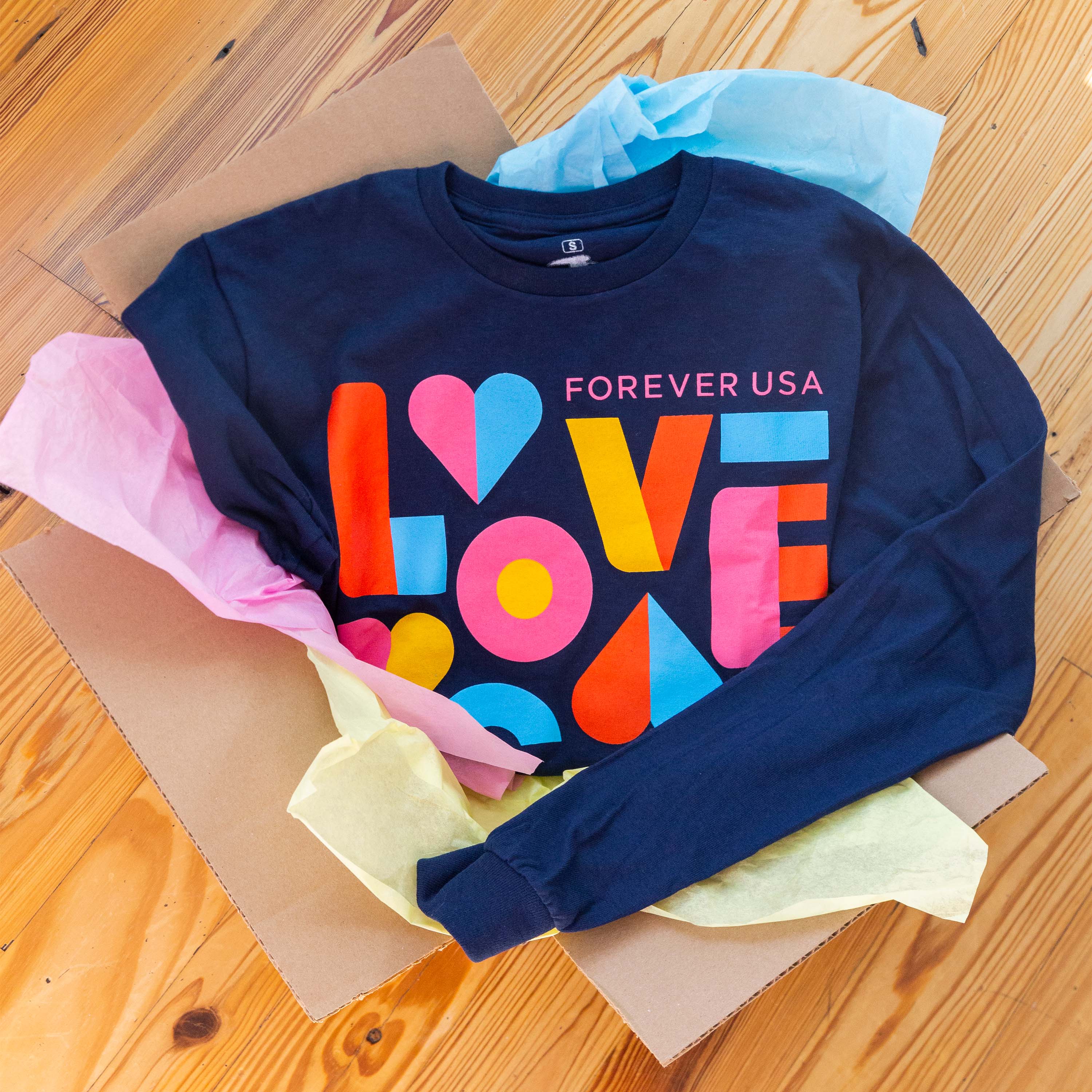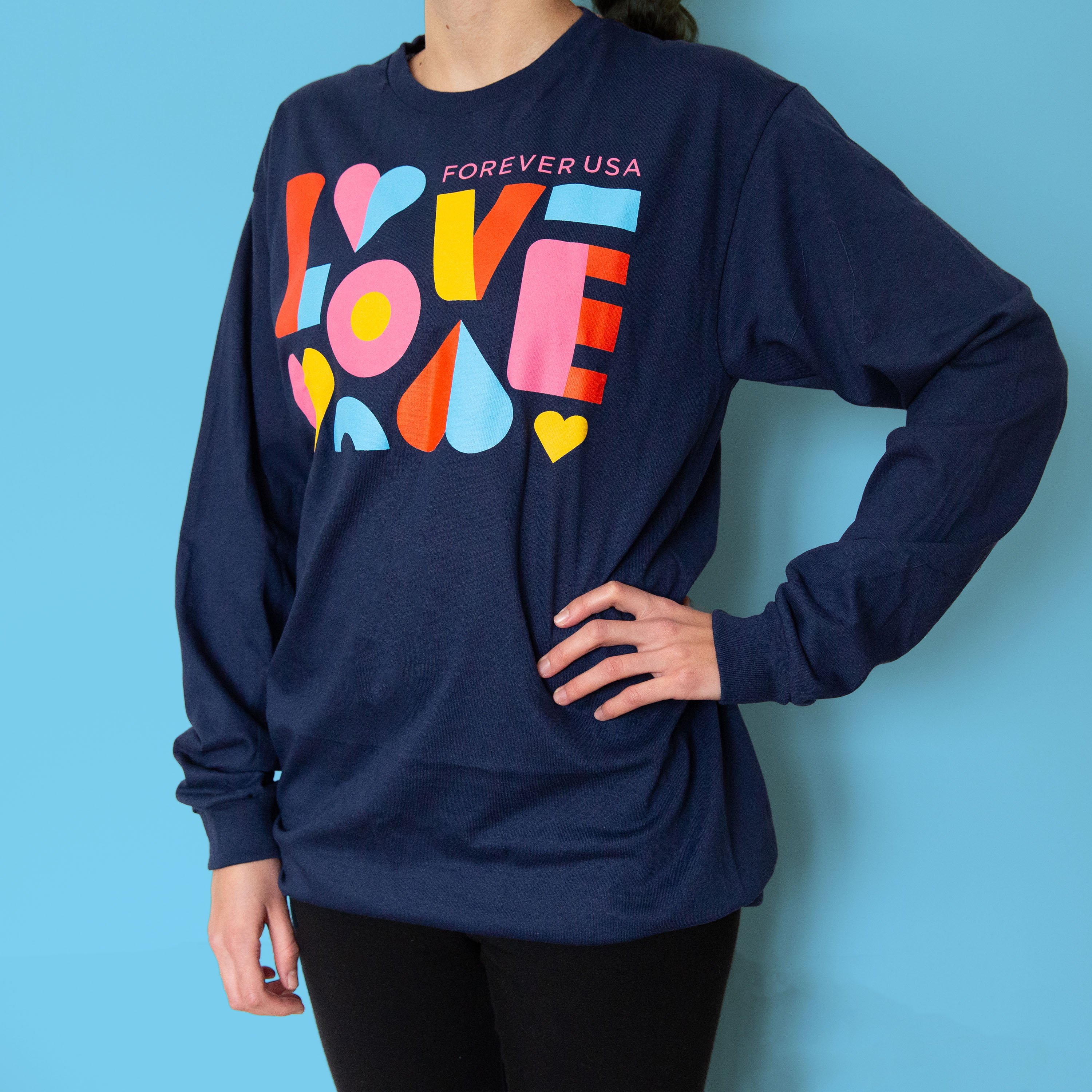 Celebrate the many ways to say "I love you" with this long sleeve, dark navy crew neck tee that features the Love stamp art on the front and comes with a collectible cancellation hangtag.