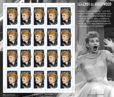 The U.S. Postal Service honored Lucille Ball with this seventh stamp in the Legends of Hollywood series. Artist Drew Struzan based his painting on a circa 1955 photograph.