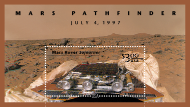 The Postal Service issued a 3-dollar Priority Mail stamp, the Mars Pathfinder Souvenir Sheet, on December 10, 1997, in Pasadena, California. The stamp features the Sojourner rover resting on the Pathfinder with a panoramic view of the Ares Vallis region of Mars in the background.