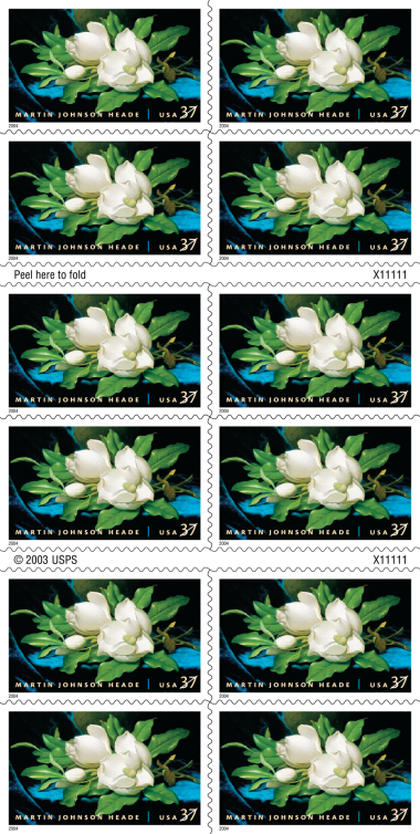 For this fourth issuance in the American Treasures series, art director Derry Noyes chose Giant Magnolias on a Blue Velvet Cloth, a circa 1890 oil-on-canvas by Martin Johnson Heade. The painting is in the collection of the National Gallery of Art in Washington, D.C.