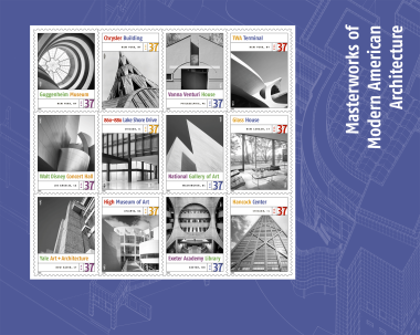 With this stamp pane, the U.S. Postal Service salutes 12 masterworks of modern American architecture. Art director Derry Noyes and designer Margaret Bauer chose breathtaking photographs to honor each building. The picture of the Walt Disney Concert Hall is by Todd Eberle. Guido Guidi photographed the twin apartment towers at 860-880 Lake Shore Drive in Chicago. The classic image of the Chrysler Building was made by Margaret Bourke-White. The Vanna Venturi House was photographed by Matt Wargo. The East Building of the National Gallery of Art is shown in an image made by Ben Spiegel. Grant Mudford took the photograph of the Exeter Academy Library and Georg Fischer photographed the TWA Terminal. The remaining five photographs — of the Guggenheim Museum, the Yale Art and Architecture Building, the High Museum of Art, the Glass House, and the Hancock Center — are by Ezra Stoller.