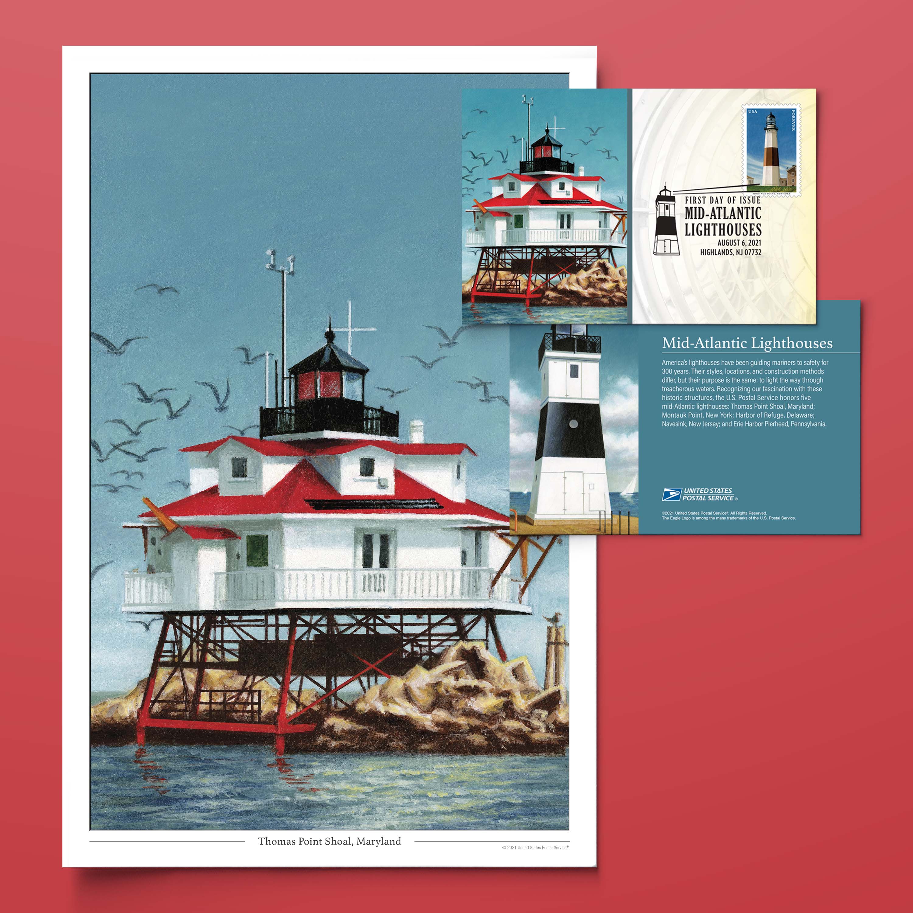Enjoy the beauty of these classic American coastal towers with this 11" (W) x 17" (H) flat print of the Thomas Point Shoal Lighthouse — one of the five lighthouses depicted on the Mid-Atlantic Lighthouses stamps.