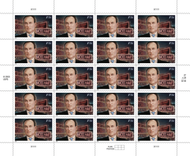 This 2004 stamp honored award-winning dramatist and director Moss Hart (1904–1961) on the 100th anniversary of his birth. The stamp art shows a painting by Tim O’Brien, based on a photograph made by Alfred Eisenstaedt showing Hart in Times Square.