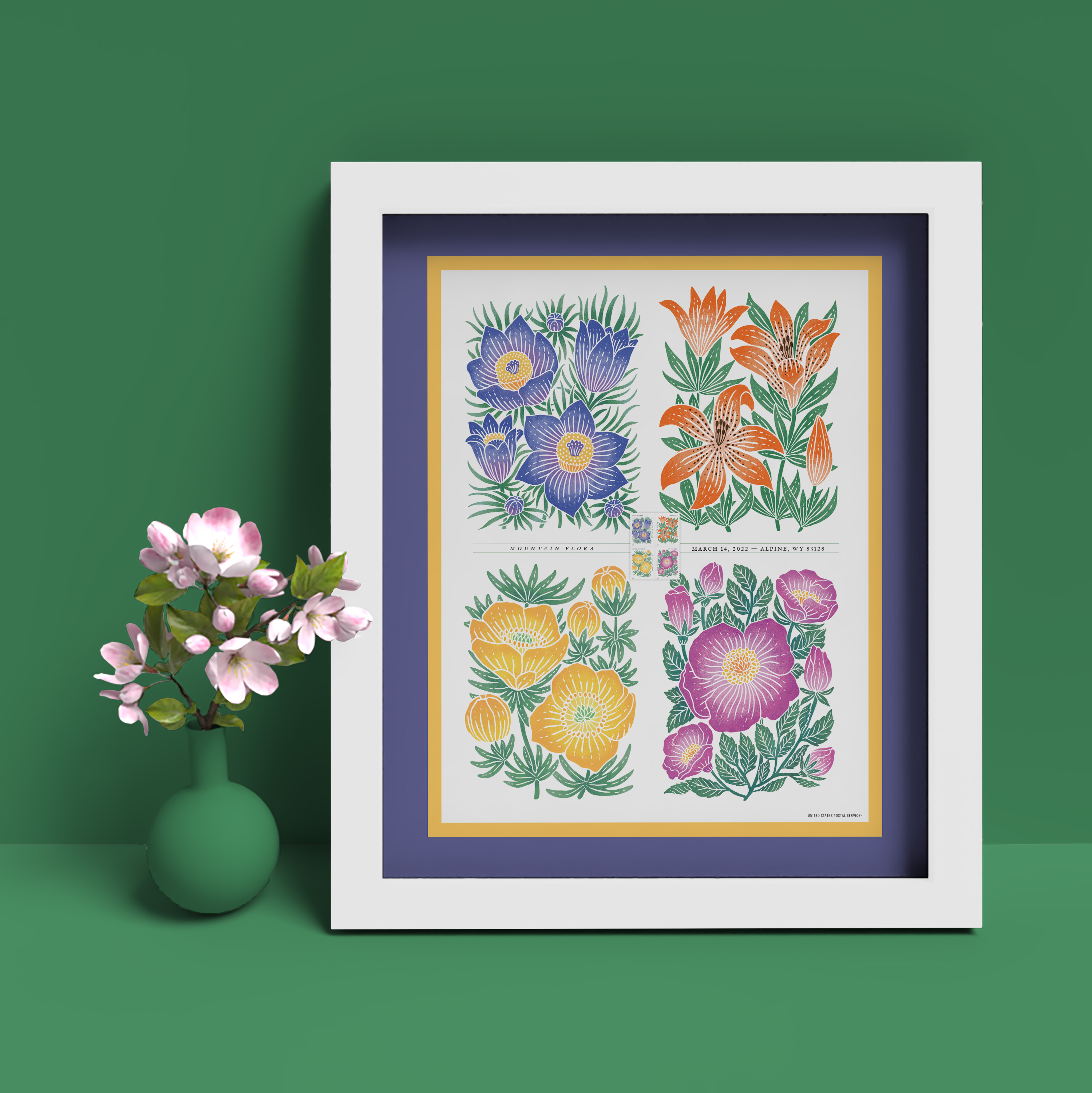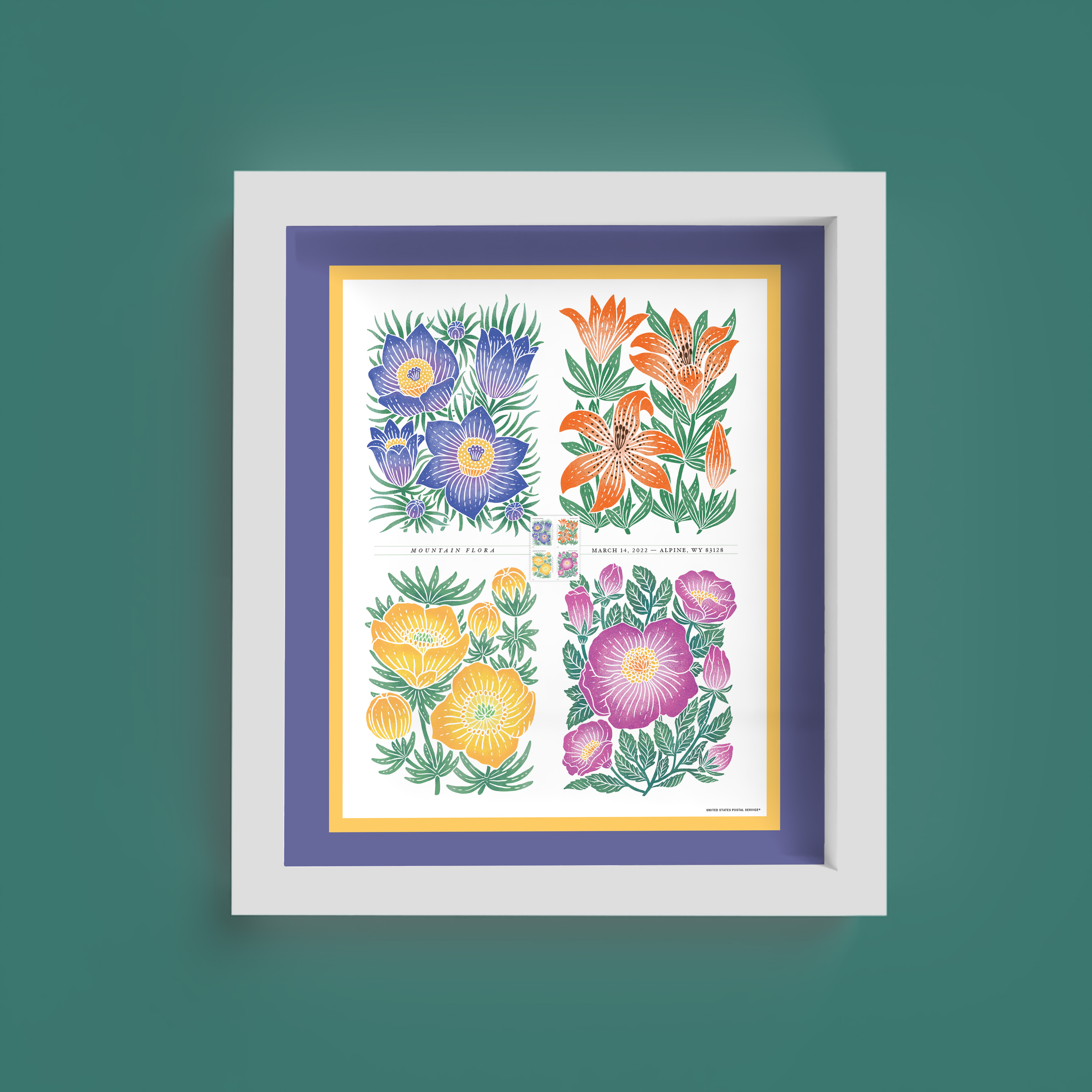 Enjoy the elegant beauty of alpine flowers with this 21.5" x 25.5" framed piece, which features the art from all four Mountain Flora stamps, plus a mounted block of four Forever® stamps and the First Day of Issue details.