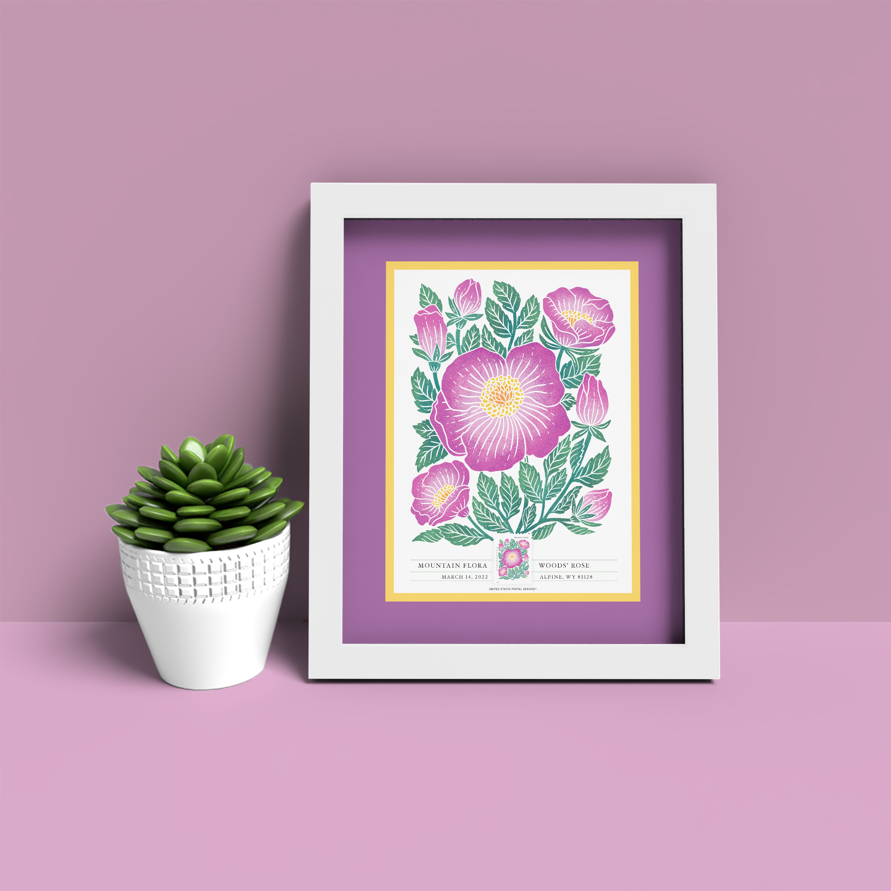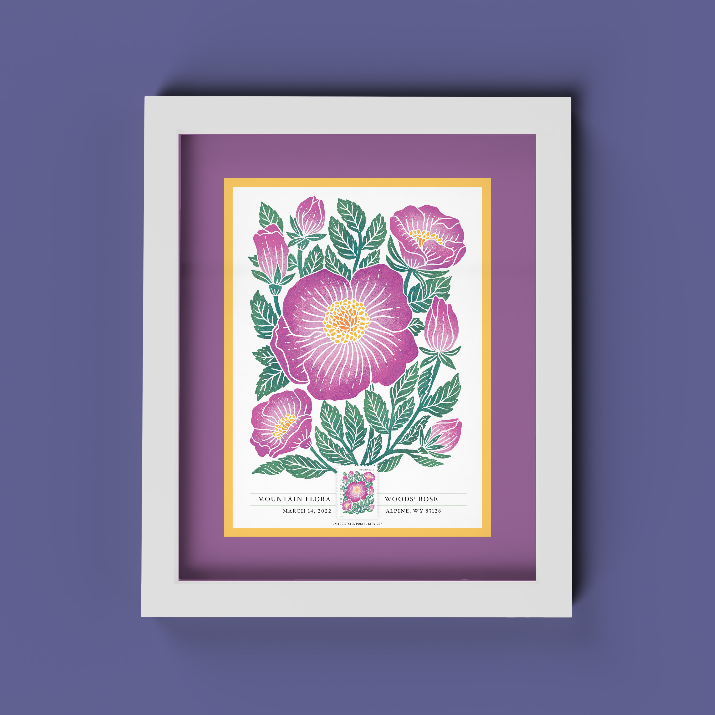 Enjoy the elegant beauty of alpine flowers with this 9.5" x 11.5" framed piece, which features the art from the Mountain Flora woods' rose stamp, plus a mounted Forever® stamp and the First Day of Issue details.