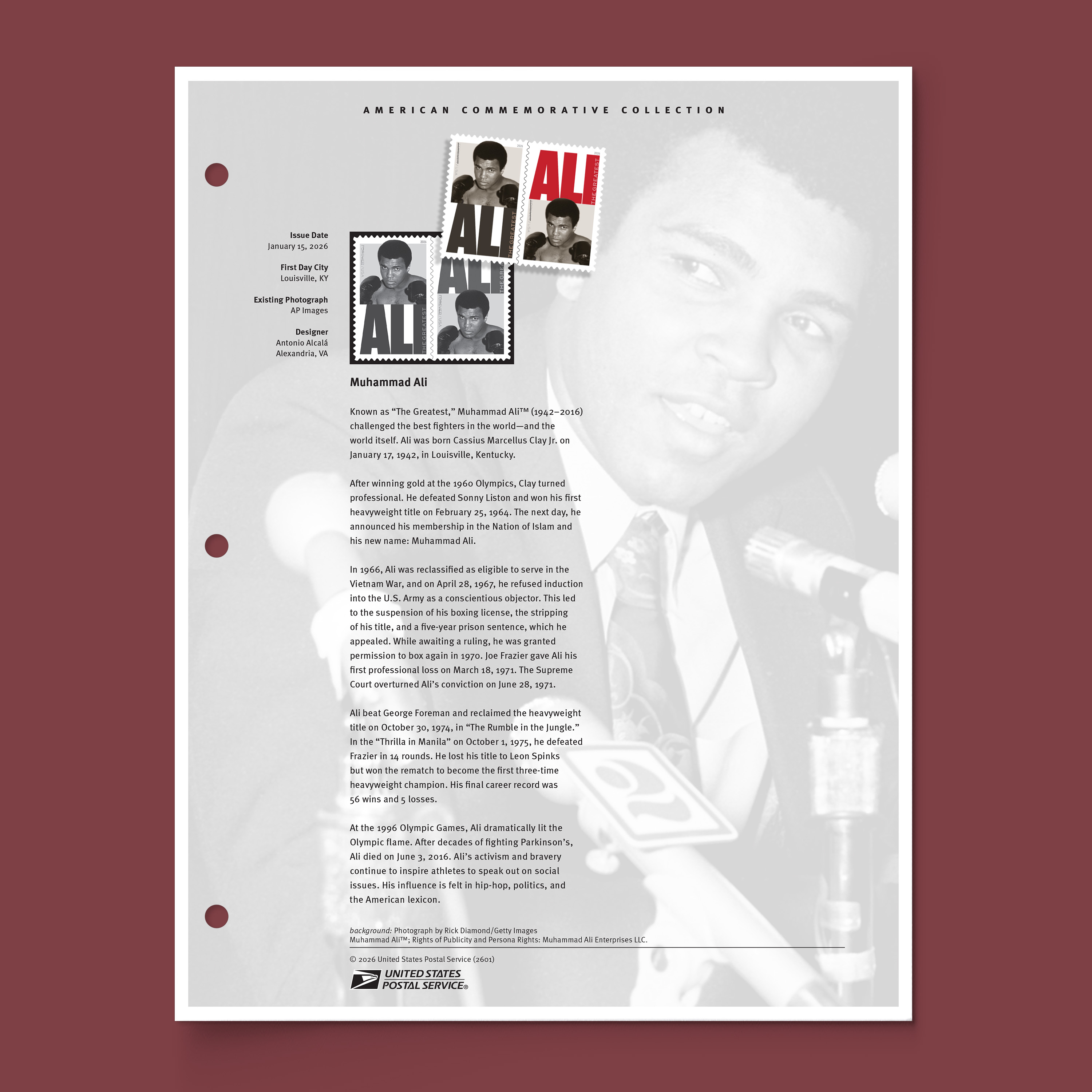 Pay homage to “The Greatest” with the Muhammad Ali American Commemorative Collection Page. The stamps in this issuance celebrate the three-time heavyweight boxing champion whose athleticism and activism outside the ring made him a global cultural icon.