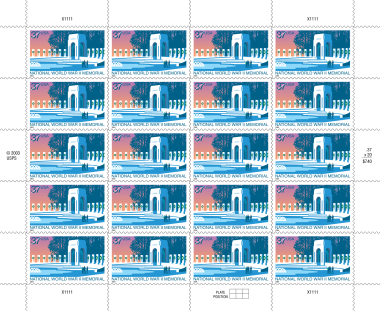 The U.S. Postal Service honors the achievement and ideals of the Americans who served during the Second World War with a stamp depicting the National World War II Memorial. Stamp artist Tom Engeman’s computer-generated design shows one of the two large memorial arches with a curving row of pillars, each representing a state or territory from the World War II era, in the background.