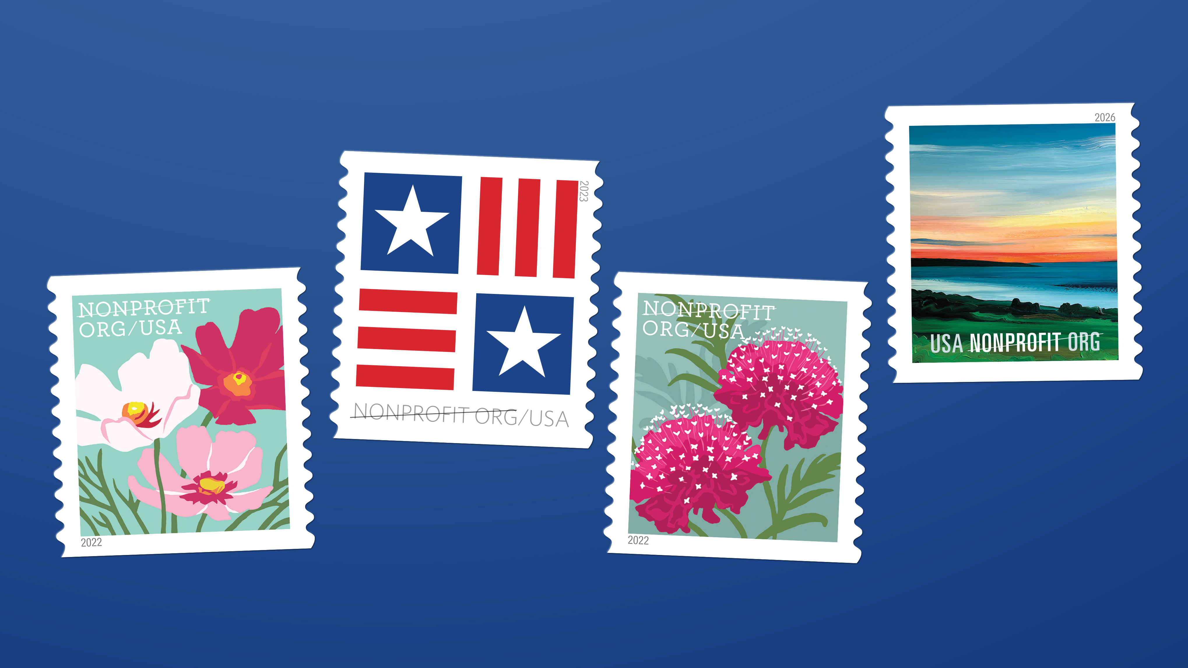 In 2023, the U.S. Postal Service issued Patriotic Block, a nondenominated, nonprofit-price stamp intended for bulk mailings by authorized nonprofit organizations and sold in self-adhesive coils of 3,000 and 10,000.
