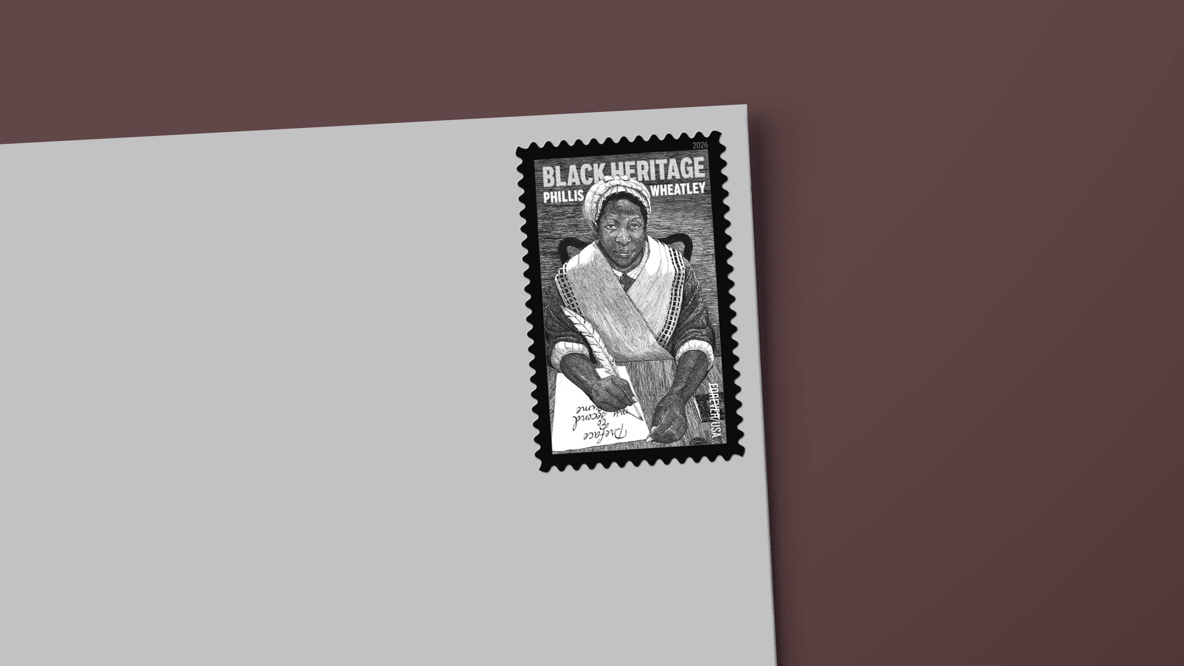 The stamp art features a black-and-white ink-on-paper portrait of Wheatley by Kerry James Marshall, who imagines her later in life, working on her second, unpublished book of poems. The design recalls the only known portrait made during her lifetime, the engraved frontispiece of her 1773 book. While that image shows Wheatley in profile, Marshall presents her looking directly at the viewer, even as she wears similar clothing and sits at the same desk. The style of his ink-on-paper portrait echoes the hatched lines of the original engraving but reinterprets the portrait, depicting Wheatley as confident, assertive, and free.