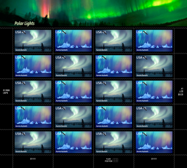In 2007, the U.S. Postal Service issued this pane of 20 stamps with two designs that feature photographs of the polar lights, often known as auroras.