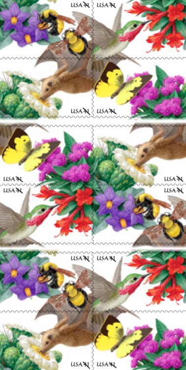 Pollination is a partnership, and the interlocking design of the Pollination stamps reinforces the interconnectedness of nature. Strengthening that connection is one goal of The Pollinator Partnership (www.pollinator.org), an outreach program of the North American Pollinator Protection Campaign (NAPPC), a cooperative conservation partnership of more than 120 organizations and individuals working across North America to support pollinators. The U.S. Postal Service and NAPPC recognize the importance of plant/pollinator relationships.