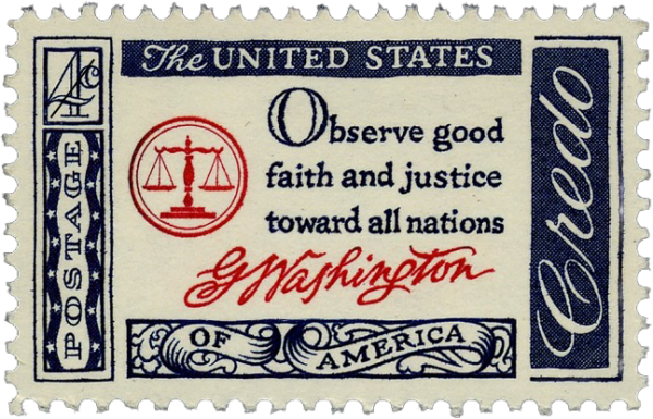 The Post Office Department issued the first stamp in the American Credo series on January 20, 1960, at Mount Vernon, Virginia, the home of George Washington. The 4-cent stamp features words from Washington's Farewell Address (September 17, 1796), "Observe good faith and justice toward all nations." Like the other American Credo stamps, the 4-cent Washington paid the postage for a one-ounce domestic-rate letter.
