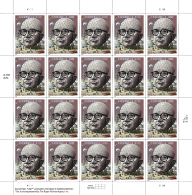 This 2004 stamp honored inventor, architect, engineer, designer, geometrician, cartographer, and philosopher R. Buckminster Fuller (1895–1983) on the 50th anniversary of his patent for the geodesic dome, his most famous invention. Hailed as "one of the greatest minds of our times," Fuller was renowned for his comprehensive perspective on the world’s problems. For more than five decades, he developed pioneering solutions that reflected his commitment to the potential of innovative design to create technology that does "more with less" and thereby improves human lives.