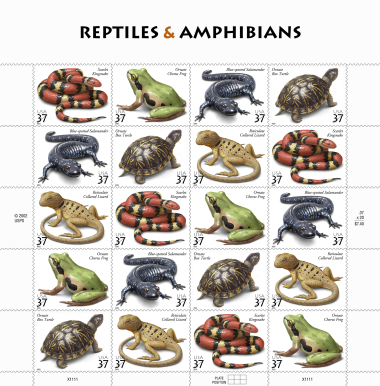 This pane of 20 stamps, issued in 2003, features five digital illustrations by Steve Buchanan of two amphibians and three reptiles native to the United States: the blue-spotted salamander, the ornate chorus frog, the reticulate collared lizard, the ornate box turtle, and the scarlet kingsnake. The five designs are repeated four times each.